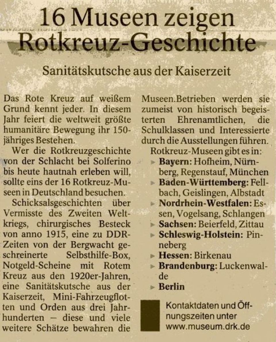 Die Berichterstattung über die Rotkreuzmuseen im DRK-Jahrbuch scheint Wirkung zu entfalten. Der Artikel in der Thüringer Allgemeinen beruht offensichtlich auf dem Jahrbuch des Deutschen Roten Kreuzes.
