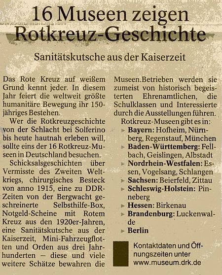Luckenwalde. Mit einem Kurzvortrag zum Thema „Museumsarbeit und Ehrenamt in Brandenburg.“ wird Brandenburgs Ministerin für Wissenschaft, Forschung und Kultur, Frau Prof. Dr. Sabine Kunst, am Sonnabend, den 22. September 2012 gegen 9.30 Uhr die 13. Jahrestagung der Arbeitsgemeinschaft der deutschen Rotkreuz-Museen im HAUS DES EHRENAMTS in Luckenwalde, Neue Parkstraße 18, (Schulungsraum Erdgeschoss) eröffnen.