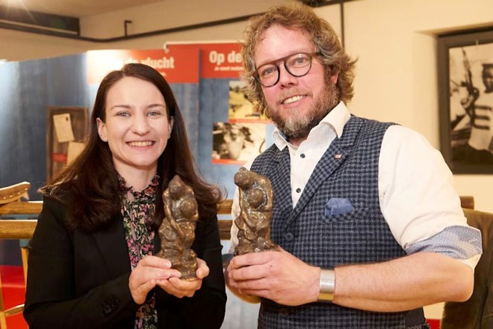 Jägersküpper erinnerte in seiner Dankesrede an die Anfänge des Museums: „2010 bin ich mit Rolf Zimmermann zum ersten Mal in das damalige, leerstehende Kameradschaftshaus gegangen. Rolf hat auf dieser grünen, abblätternden Betonwand, kalt und überhaupt nicht einladend, ein Bild von einem Museum gemalt – an einem Ort, an dem man eigentlich zurückblickt. Doch er hatte die Vision eines Museums, das nach vorne schaut.“